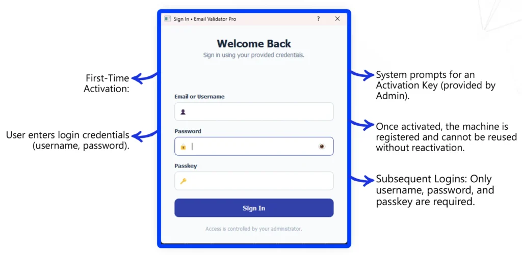 First-time users must log in using their credentials and enter a one-time activation key provided by the administrator. This binds the software to the machine and prevents reuse without reactivation.