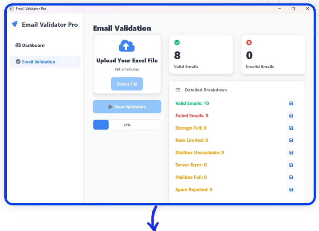 Users can upload Excel files (.xlsx) containing email lists. After validation, categorized results are downloadable as separate Excel files for easy access.